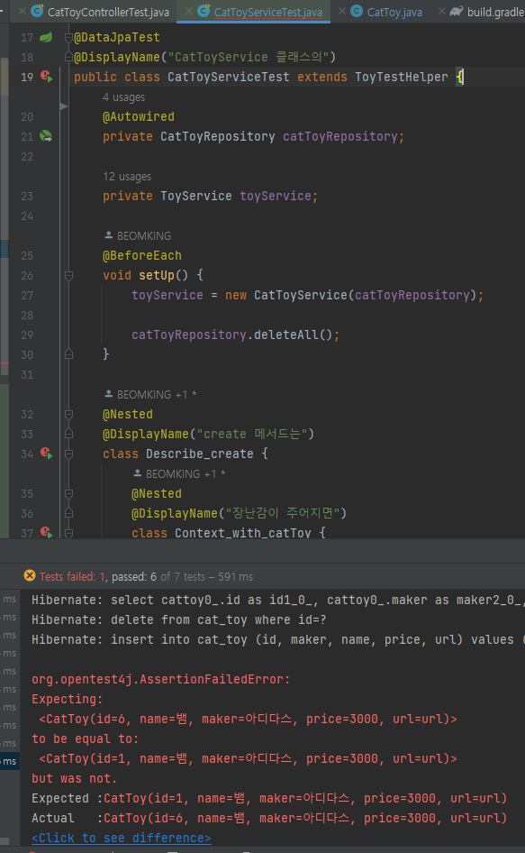 위 테스트 코드와 함께 보면 난 테스트 결과로 id가 1인 경우를 기대하고 있었으나 실제로 생성된 id는 6이라서 테스트가 실패했다는 것이다.