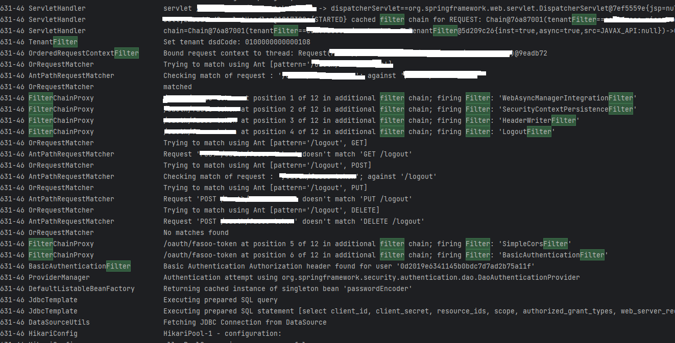 로그를 살펴보니 필터 체인 중 6번째에서 걸러지고 있어 내 필터에 도착하지 못하는 것이었다.