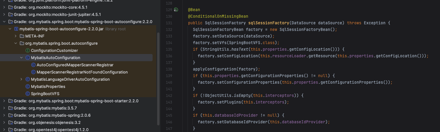→ 우리가 SqlSessionFactory를 Custom하기 위해 Bean으로 등록을 했기 때문에 @ConditionalOnMissingBean의 조건을 만족하지 않아(Bean Factory에 이미 존재해서) 자동 구성 Bean이 등록이 되지 않는 것이다.